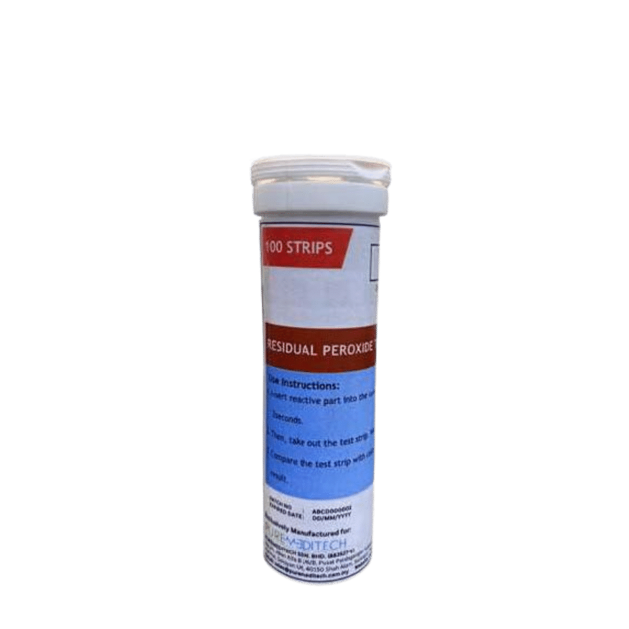Peroxy is a test strip use in residual peroxide test in hykleen solution For testing of residual peroxide, the test should be equally sensitive to both peracetic acid and hydrogen peroxide Peroxy test strip reacts equally with both peroxide chemicals